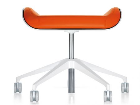 Die Sitz Polsterung ist ein atmungsaktiver Formschaum, FCKW und CKW frei (sortenrein). Er hat ein optimales Mikroklima durch unverklebte Polster und ist damit atmungsaktiv. Die Sitztiefenfederung funktioniert auch in der unterster Position noch, so dass die Dämpfung des Hinsetzstoßes und damit die Schonung der Wirbelsäule gewährleistet ist. Typisch ist die Ausführung mit einem 4 Fußkreuz und Konferenzgleitern. Alternativ ist er mit einem 5 Fußkreuz und gebremsten Doppelrollen ausgeführt.